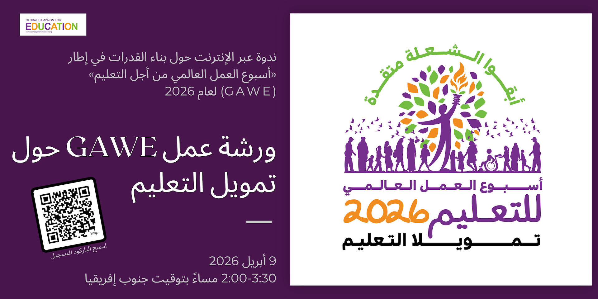 ستستضيف حملة التعليم للجميع (GCE) ورشة عمل تعليمية عبر الإنترنت حول تمويل التعليم في 9 أبريل 2026، من الساعة 2:00 إلى 3:30 مساءً بتوقيت جنوب إفريقيا (SAST)، تجمع بين منظمات المجتمع المدني ومجموعات الشباب والتحالفات التعليمية الوطنية والشركاء لتعزيز جهود الدعوة بشأن تمويل التعليم في الفترة التي تسبق «أسبوع العمل العالمي من أجل التعليم» (GAWE) لعام 2026.