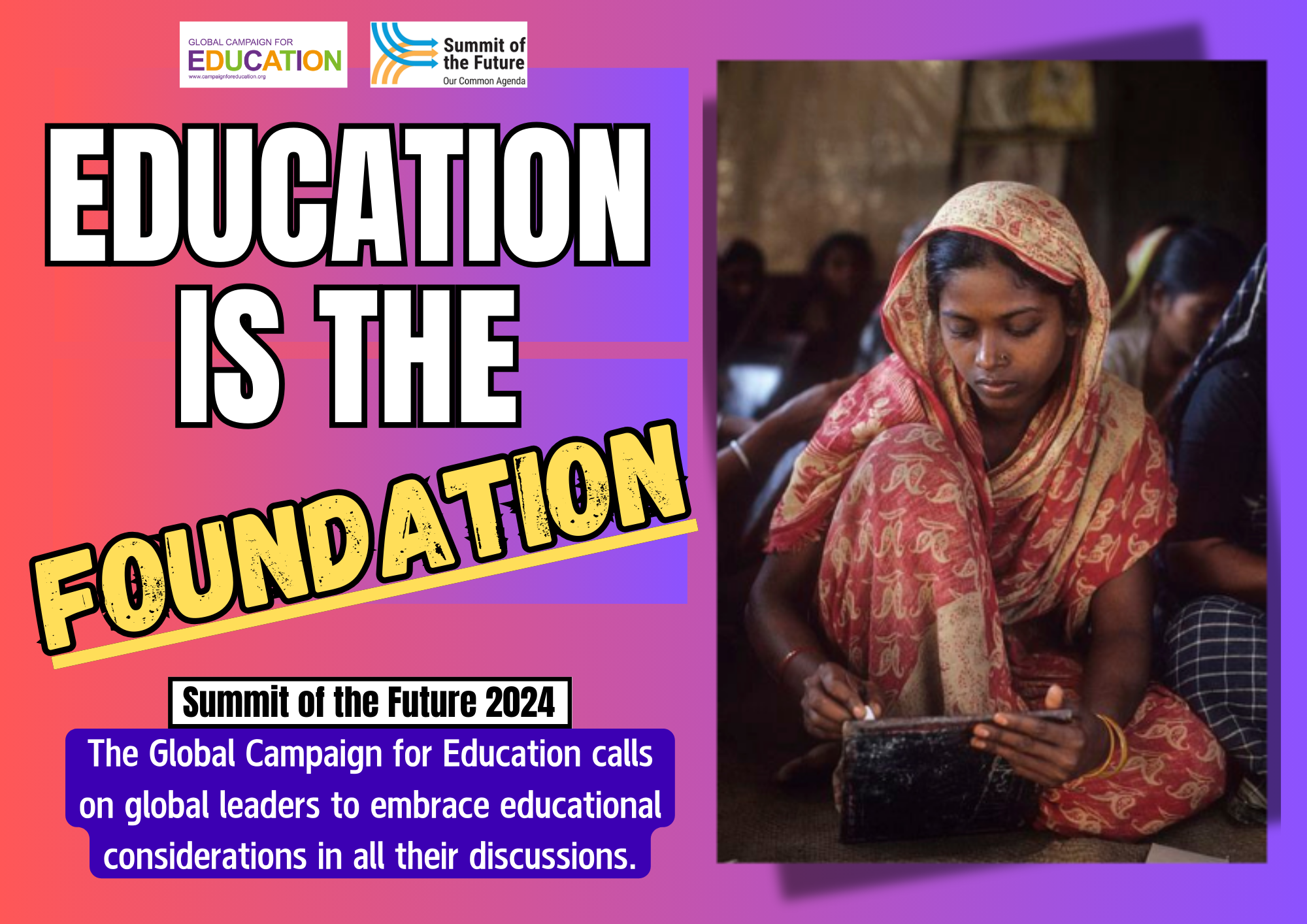 تأسف الحملة العالمية للتعليم بشدة لأن الدول الأعضاء في الأمم المتحدة أضاعت فرصة تعزيز الأبعاد التعليمية في الموضوعات المهمة المدرجة في ميثاق المستقبل، وبالتالي فشلت في الإشارة بشكل جوهري إلى الأسس المجتمعية الأساسية لضمان السلام والعدالة والديمقراطية والمساواة، والتي لا يمكن بناؤها إلا من خلال التعليم.